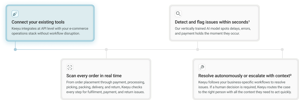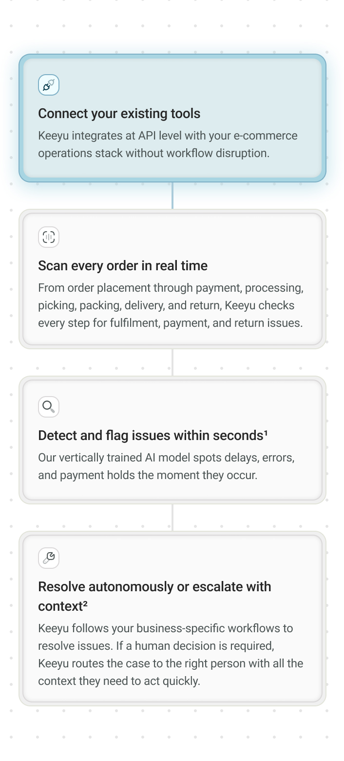 Keeyu gives your team real-time visibility across every order, so they can resolve issues before they become tickets.