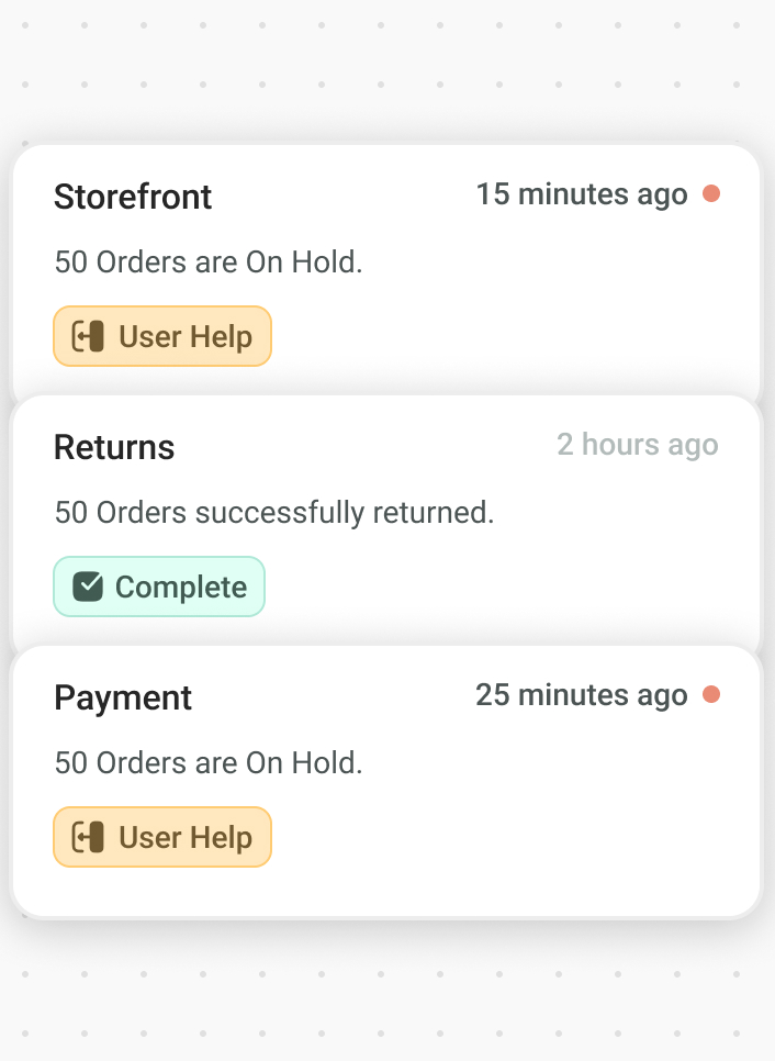 Get notified before small hiccups turn into customer-impacting issues, with real-time monitoring across payment, fulfilment and support workflows.